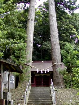 境内に入ると、正面に杉の大木が二本そびえ、その奥に社殿が見える。
