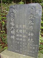 式内社下立松原神社 当社は天日鷲命を祀る社で、昔、天富命が天日鷲命の孫由布津主命が、祖神を祀ったのが当社である。当時鹿などの獣が住民の農作物を荒すので、神々が狩りを行い、獣の害を除いた神恩に感謝する祭が今も神狩の祭として行われ、また狩りで捕えた大鹿の角が社宝として現存している。 武将の尊崇も厚く、源頼朝公、里見義実公も太刀を献納し武運を祈っている。 −『平成祭データ』− |