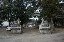 大きな狛犬があり、池を通って参道を進む。