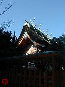 本殿の屋根には、内削ぎ、外削ぎが交差した珍しい千木が並んでいた。