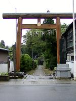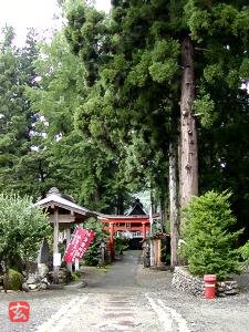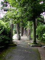 貫の貫通しない鳥居と、やや下る参道、スギ並木が特徴だが、