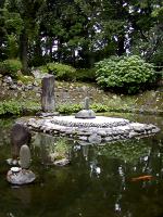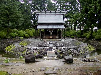池中に石の築山があり、その上に鎮座。
