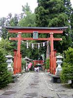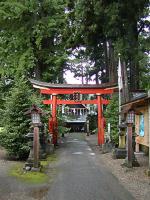 朱の鳥居が参道に二つ並んで、奥に社殿がある。
