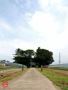 農道のような参道が北へ伸び、こんもりとした森の前に鳥居。