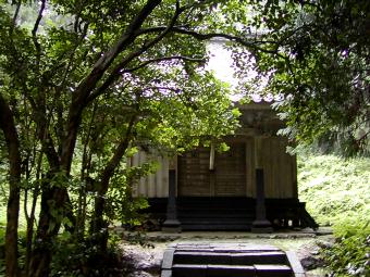 左に参道を折れ、さらに右へ進むと木々の間に社殿が鎮座している。
