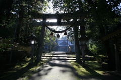 昇る朝日に向って緩やかに上る参道を歩くと逆光の鳥居。