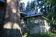 拝殿は瓦葺入母屋造、後方の瑞垣に囲まれた本殿は銅板葺神明造。