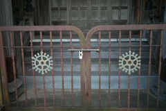 拝殿の前面に鉄の門扉が設置されており、輪宝紋が付けられていた。