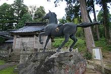 神馬像や社殿の屋根に、植物の葉の紋が付いていた。