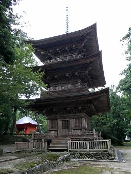 いる。本堂に向かって右手前に立つ三重の塔は、村 上城主・村上義明が願主となり、慶長19年起工 元和6年(1614年〜1620年)に完成した。昭和26〜28 年解体修理し往時の姿に復元された塔は純和風 で、歳月を重ねた木肌の美しさと荘重かつ均整 のとれた構えは周囲の老杉と調和して、国の重 要文化財としての風格を示している。 −境内入口案内板− |