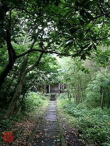 線路を東へ越えて小道があり、奥に参道らしき石段がある。
