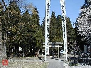 五月の参拝だが、境内には雪が残り、参道には桜が咲いている。