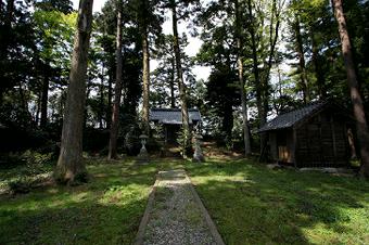 参道正面に、高い木に囲まれて社殿が鎮座。