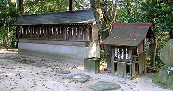 社務所の前に、幾つかの境内社が並び、