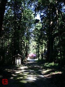 数段の階段を上り、樹木の茂った参道を2〜300m進むと社殿のある境内。