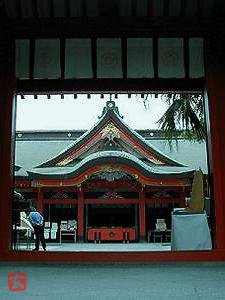 参道を歩き、神門をくぐると赤い社殿がある。