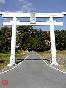 道路脇に南面して白い鳥居が立ち、