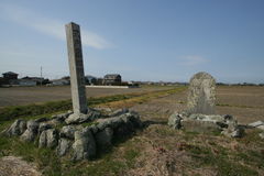 あぜ道のような参道を進むと、方形の土台に「式内畠田神社宮蹟」と刻まれた石碑。