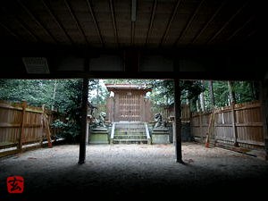 拝殿は壁の無い形式で、拝殿奥に垣に囲まれて神明造の本殿がある。