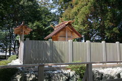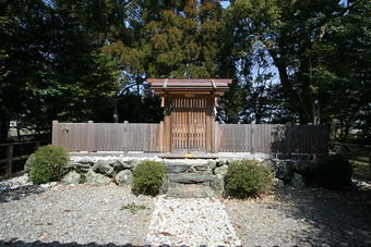拝殿の奥に、垣に囲まれた神明造の本殿がある。