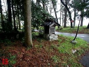 その森の入口に案内板があり、案内板のすぐ近くに小さな祠がある。