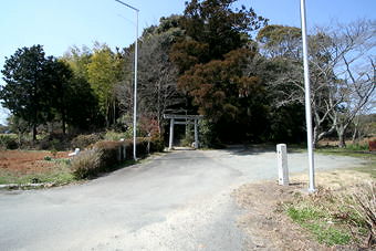 拝殿は瓦葺平入で前に木製の鳥居が立っている。