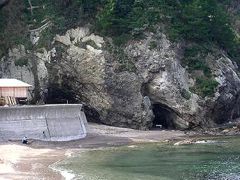 静之窟は大田市静間町魚津の海岸にあって、古 く石見地方の国造りに力をあわせて努力された 大己貴命(大国主命)と少彦名命の二神の仮の住ま いであったとの伝承があり、洞窟は奥行三十八m、 幅十八m、高さ十六mに達し、洞底は清浄な海浜 に覆われ、現在では波浪が直接侵入することはま れであろうと思われる。 門口は大小二箇所あるが奥で一つになった岩屋 がある。 この岩屋を古くから静之窟といい伝えている。 洞内の内壁や天井には、主として軽石質の火砕 岩が露出しており、ほぼ南北方向に走る節理もし くは小断層が何本か見られる。窟は、侵食に弱い 部分がこれらの弱線に沿って選択的に侵食が進ん だ結果生じた海食洞である。 中央には大正四年に万葉歌碑がたてられ、歌人 生石村主真人が詠んだ「大汝少彦名のいましけむ 志都の石室は幾代経ぬらぬ」(書は千家尊福)の 歌碑(高さ三m)が建っている。「静之窟」の題 字は徳川家達である。 −案内板より− 案内により、若干の違いがあるが、原文のまま記載。