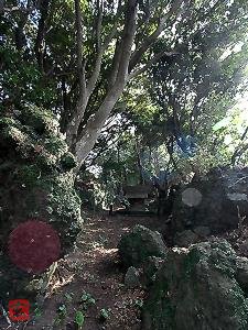 岩に囲まれた社殿背後に到着 後の自然石が奥の院の大山祇神石体 |