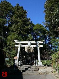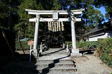 民家の間の生垣の参道を進むと、石の鳥居が立っており、