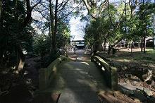 鬱蒼と茂る樹木に囲まれた参道を進むと石橋があり、参道脇に御神馬像。