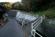 橋を渡り、坂道を登ると階段。