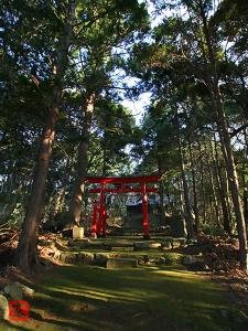 階段を登ると、苔生した参道の中に、真っ赤な鳥居が鮮やか。