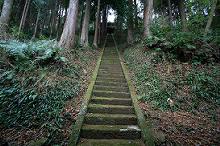 拝殿の後方に、丘を登る真っ直ぐな階段。
