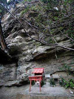 岩の麓に小さな赤い小祠があるが、