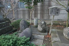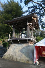 参道左手に力石や御神木、手水舎があり、左手には梵鐘。