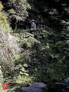 小川が、ささやかな滝になっている、その向うに祠が見える。