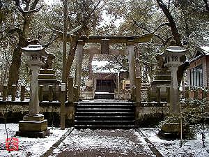 広い社叢中央にある、雪解け水の滴る参道を歩くと、