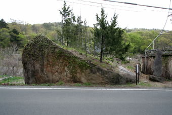亀沢川の河岸段丘上に位置しており、周囲約 五五メートル、高さ八・三メートルの花崗岩の 大岩塊で、土石流か火砕流によって上流部から 運ばれてきたものと考えられています。