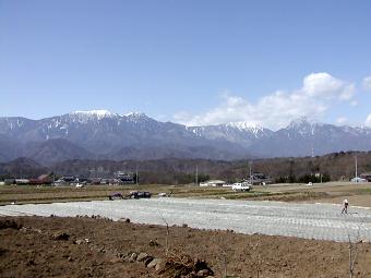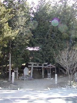神社は西向きで、境内からはアルプスの山々が青い空の下に連なっている。