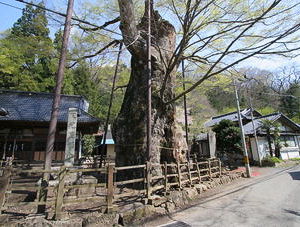 国指定天然記念物の「根古屋神社の大ケヤキ」と呼ばれており、境内案内板では樹齢800年。