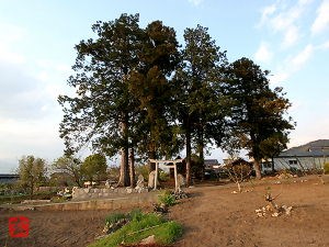 畑に面して南西向きに社域の杜。集落のはずれにある鎮守の森。そんな境内。