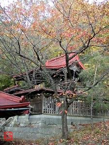 階段上には、社殿があり、後方に赤い屋根の本殿。