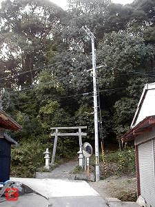 狭い道の突き当たりに木造の鳥居がある。