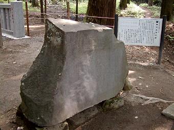神社のうしろの荒山から下だってくる尾根の端には神跡「ひつ石」がある。古代祭シの遺跡で、ここからは関東平野が一望のうちにおさめられ、その間を流れる利根川の末は雲煙の彼方太平洋をしのばせ、南方はるかに秩父山脈を越えて富士の霊峰を望むことができる。