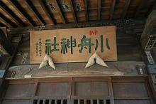 拝殿の扁額には「小舟神社」とあり賽銭箱には三つ巴紋。