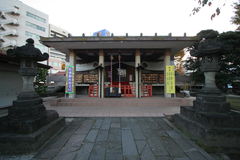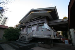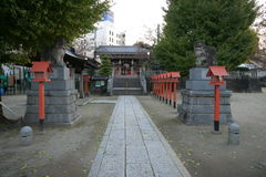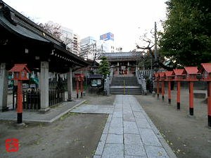 赤い灯籠が並ぶ参道を進み、階段を上るとコンクリートの社殿がある。