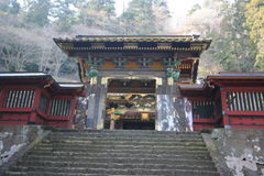 中央の唐門の奥に、復旧された当社の権現造の社殿がある。