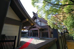 社殿全体はコンクリート造りで、鉄筋の駐車場の上にある。