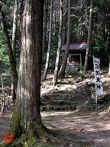 中央に木が聳え、その後方、斜面に東向きの社殿が一つ。