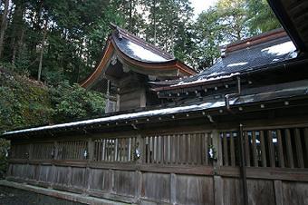 拝殿は入母屋造。その後方、玉垣の中に流造の本殿。